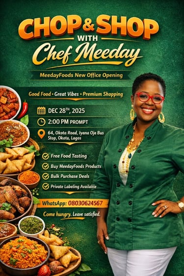 Meeday Foods, established by the talented Chef Meeday, brings culinary excellence to life with her specially crafted spices, delicious bulk chinchin, and top-notch catering services. With a commitment to quality and flavor, each dish is prepared with love, ensuring that every bite offers a unique taste experience.